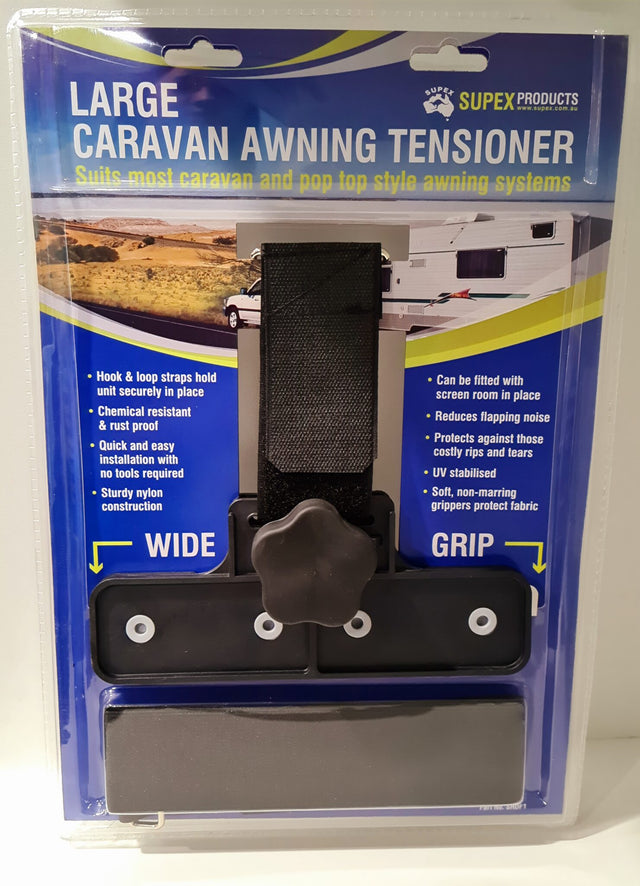 The Supex large caravan awning tensioner has a hook and loop straps which hold the unit securely in place, it is chemical resistant and rust proof, installation is quick and easy with no tools required, sturdy nylon construction, can be fitted with screen room in place, reduces flapping noise, protects against those costly rips and tears, UV stabilised, soft and non-marring grippers protect fabric.