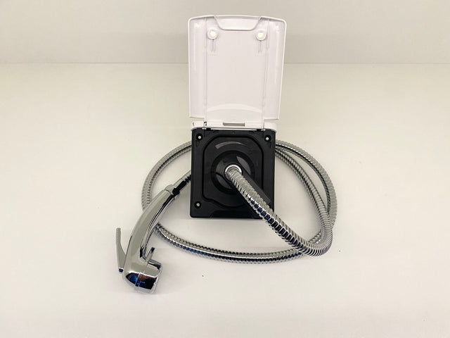An externally fitted shower point suitable for Caravans, Campers, Motorhomes and all RV's. Comes complete with shower head and flexible hose. Provides hot and cold water for showers, washing dishes or even washing the dog.